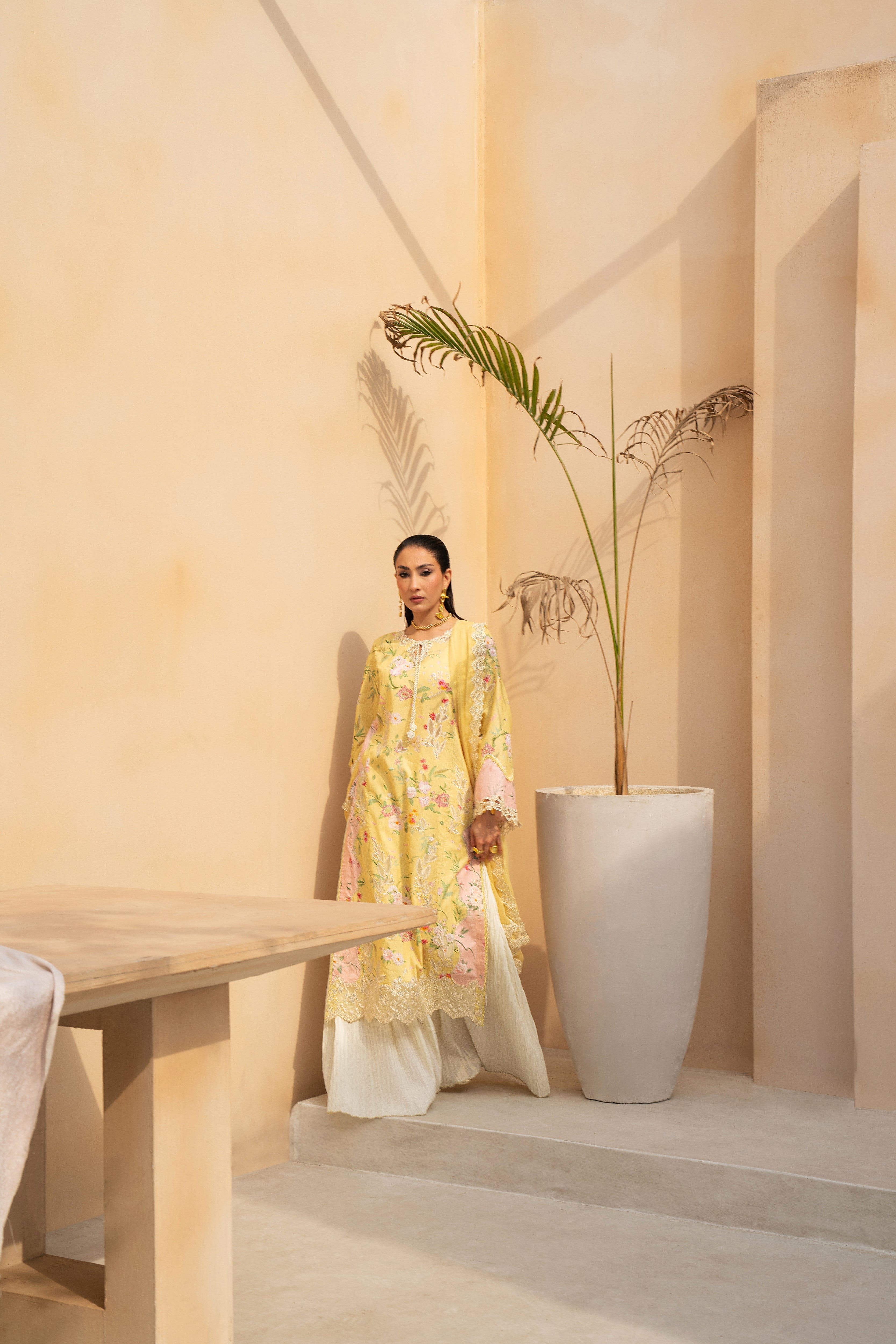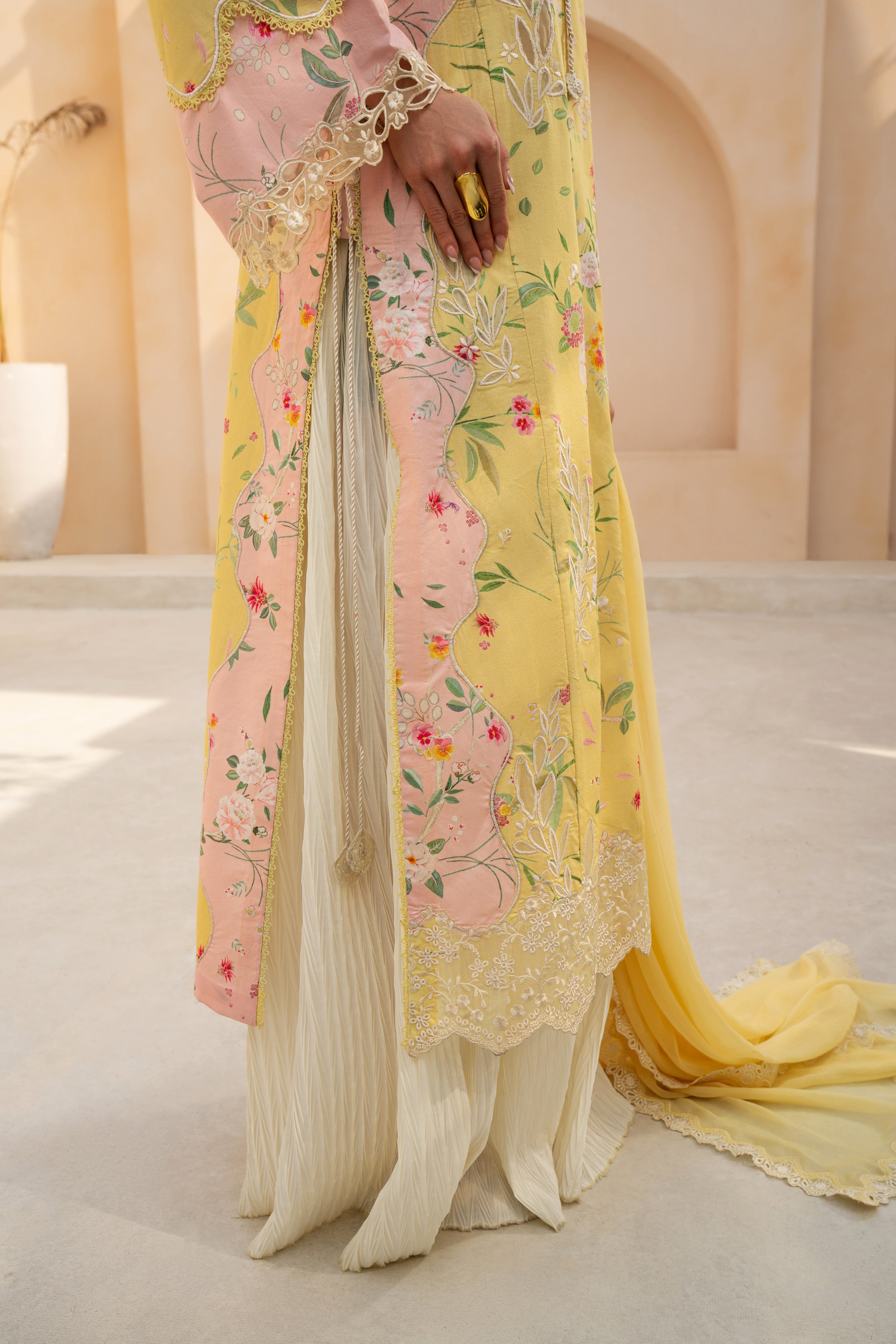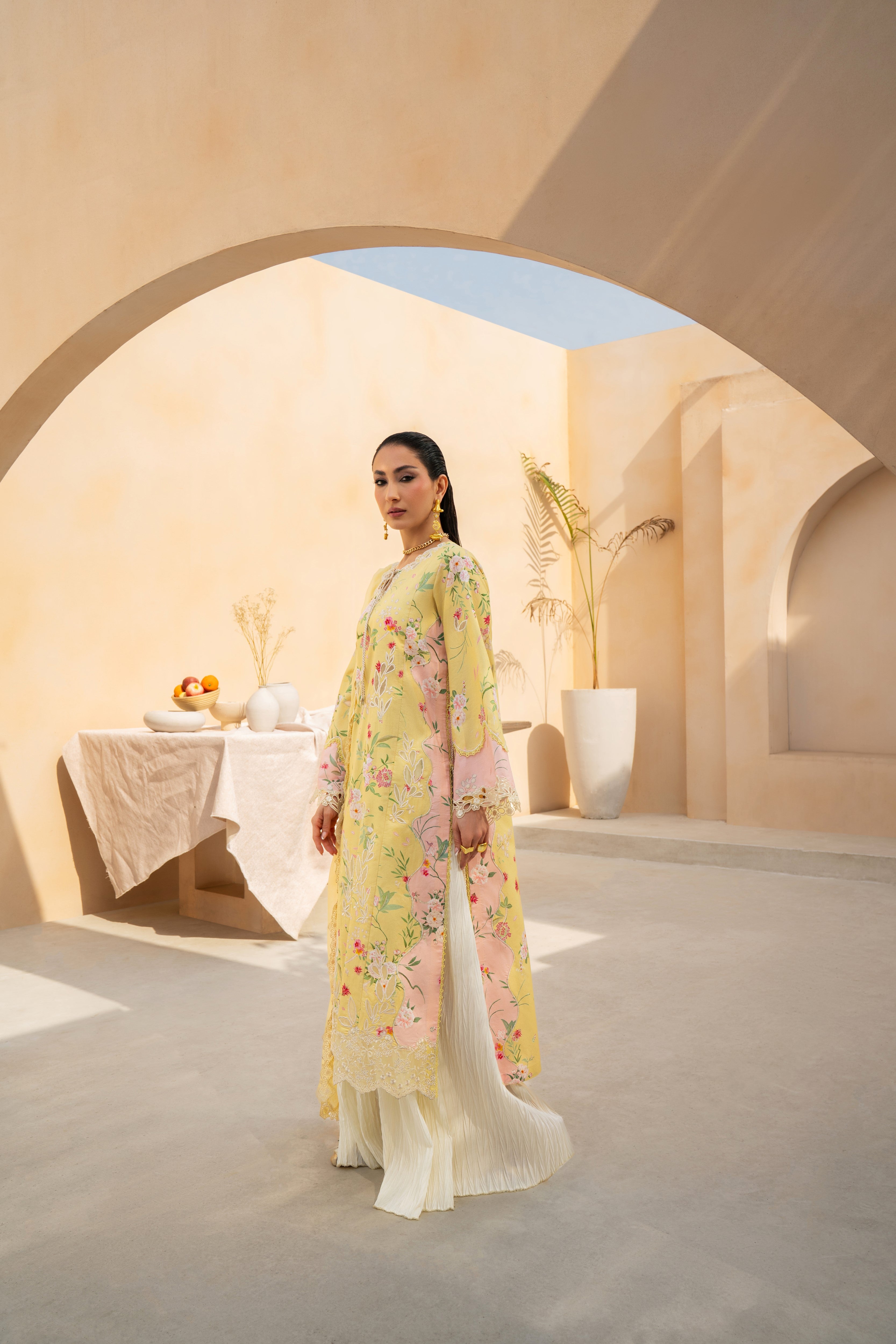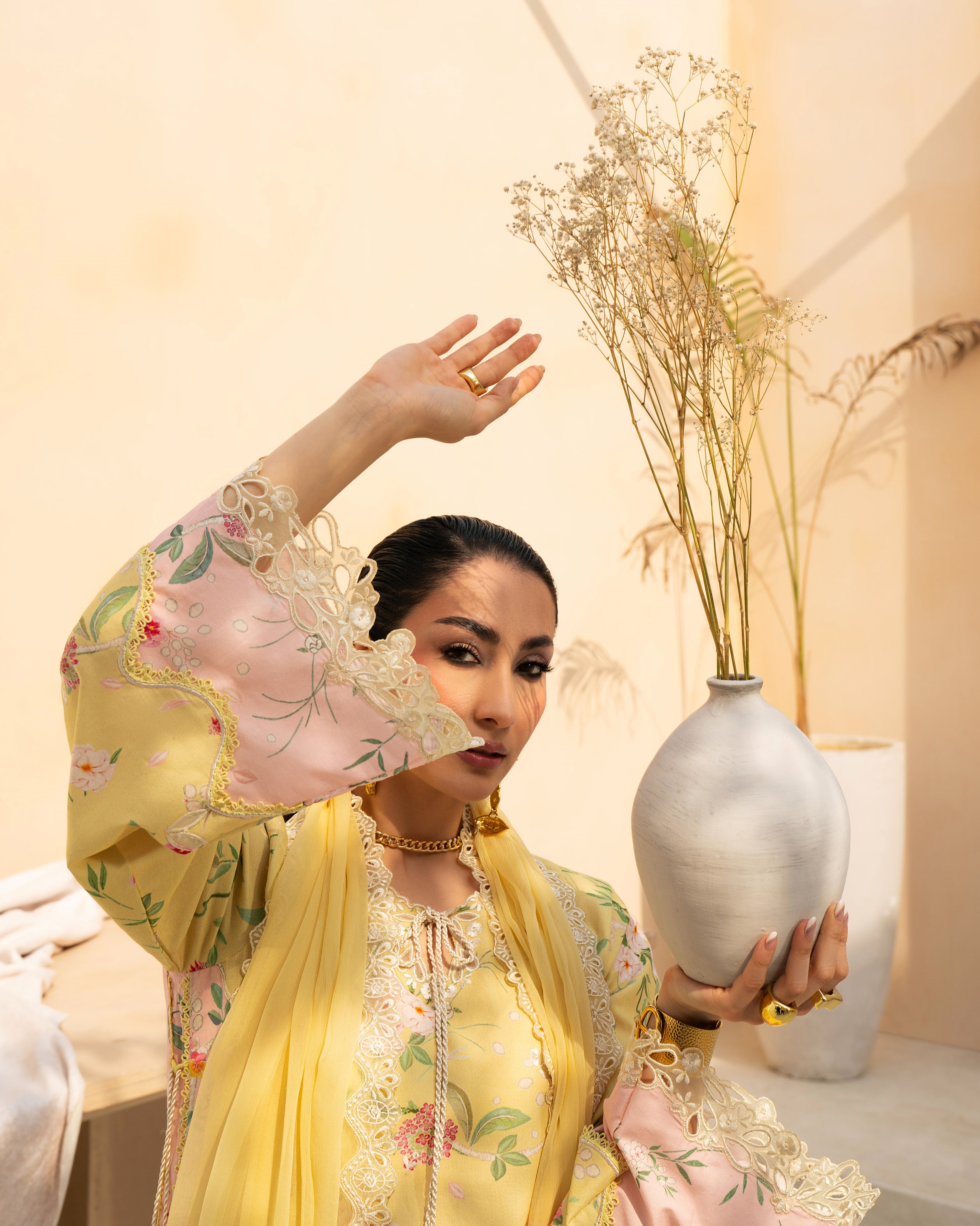 • Delicately embroidered ghera (hemline) adding traditional craftsmanship to the silhouette