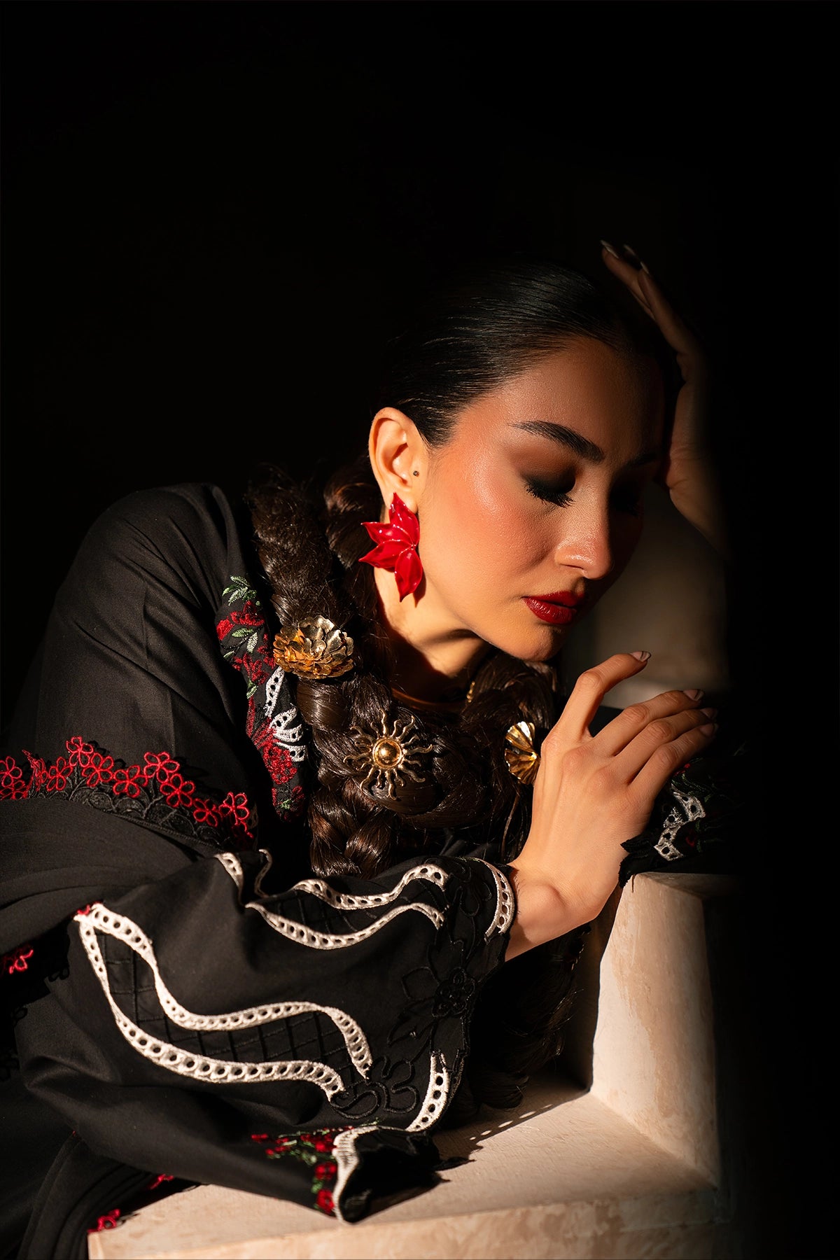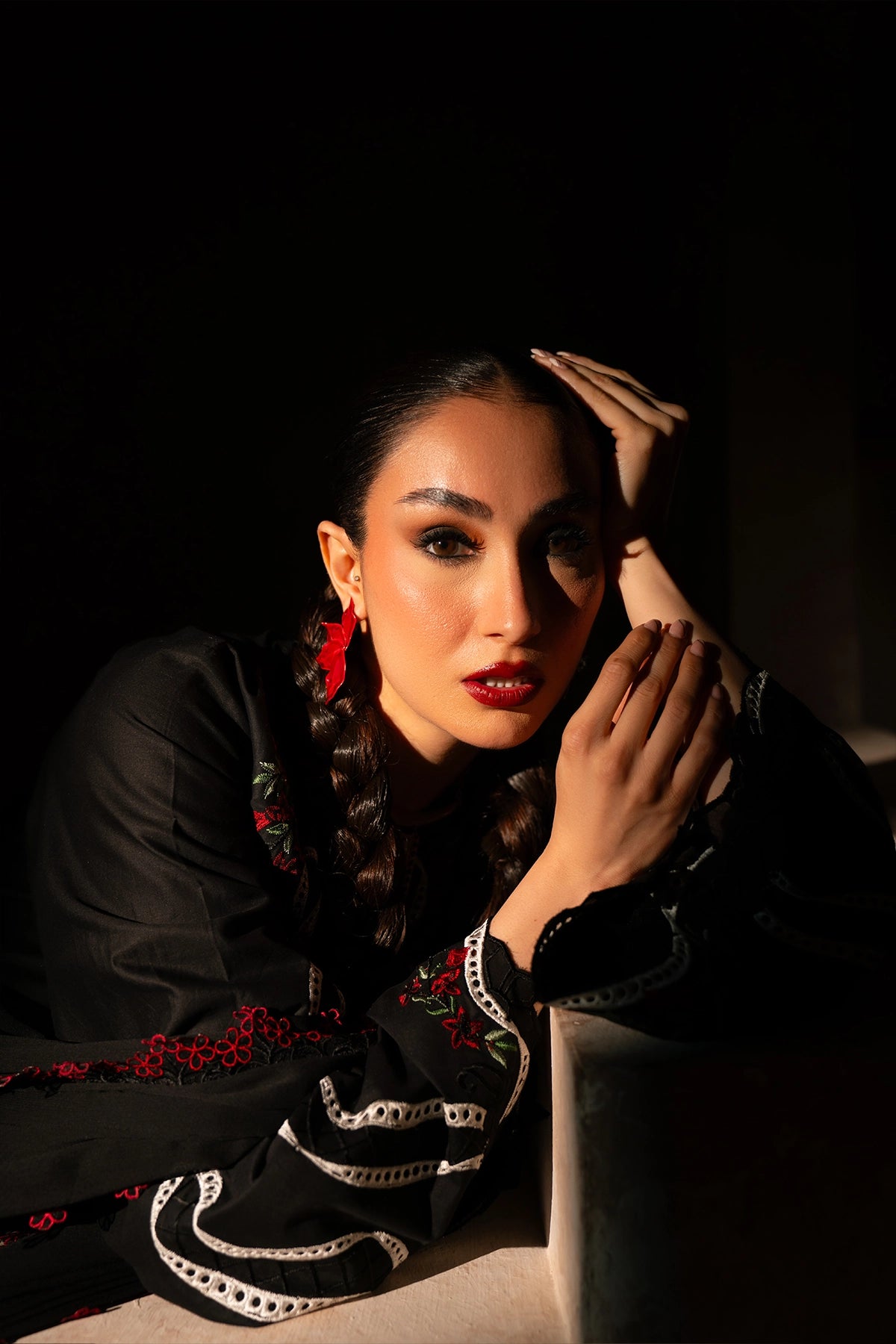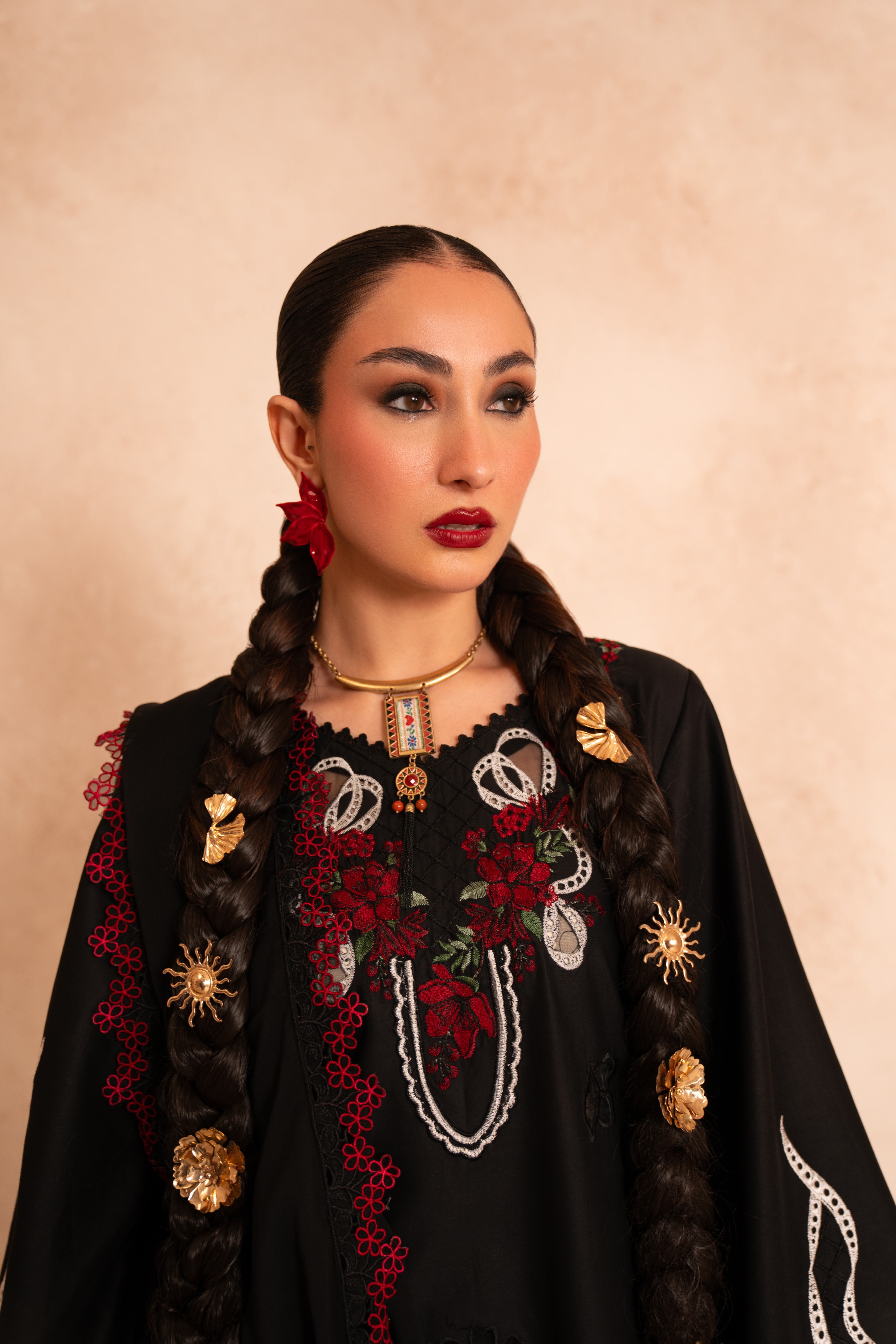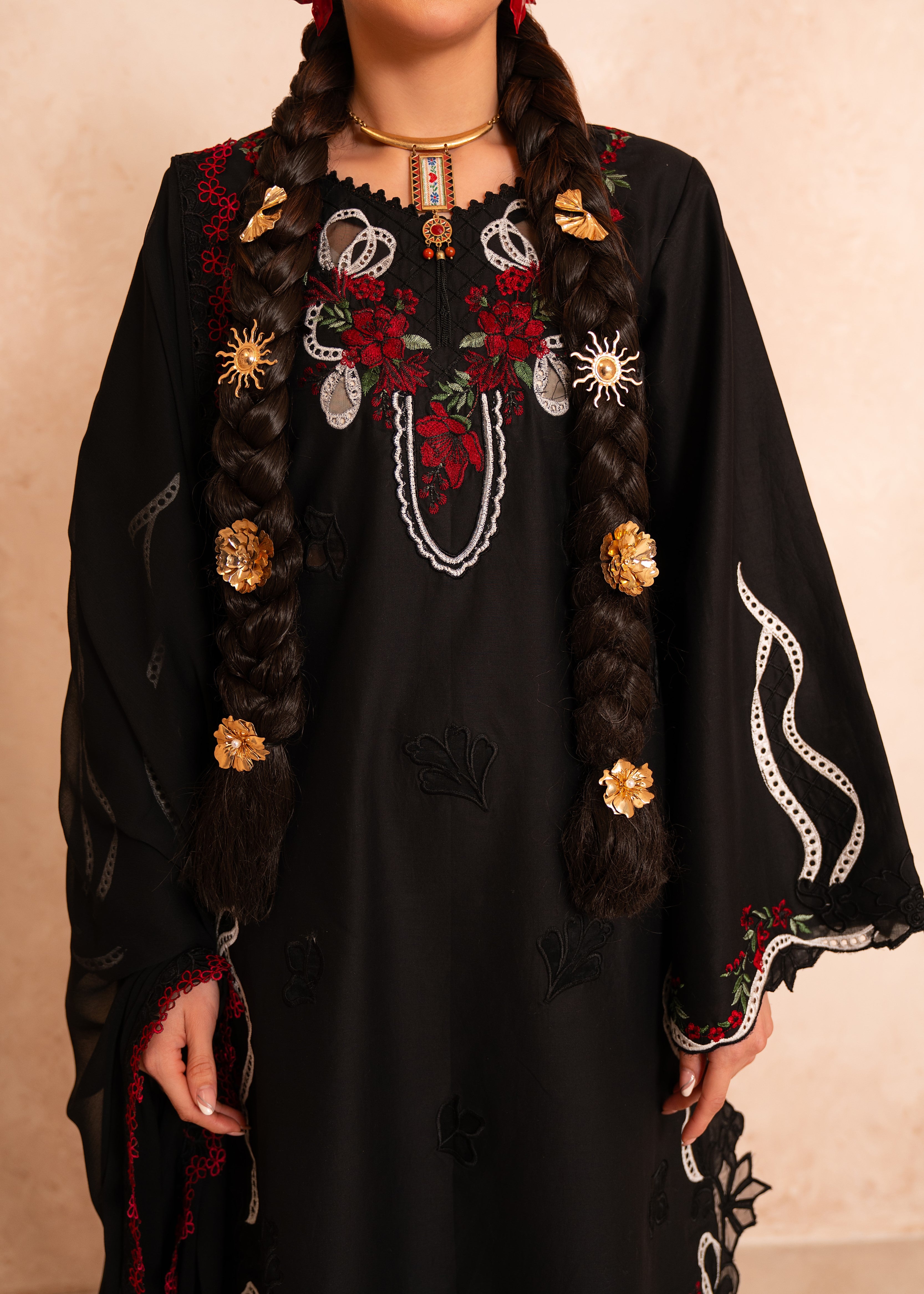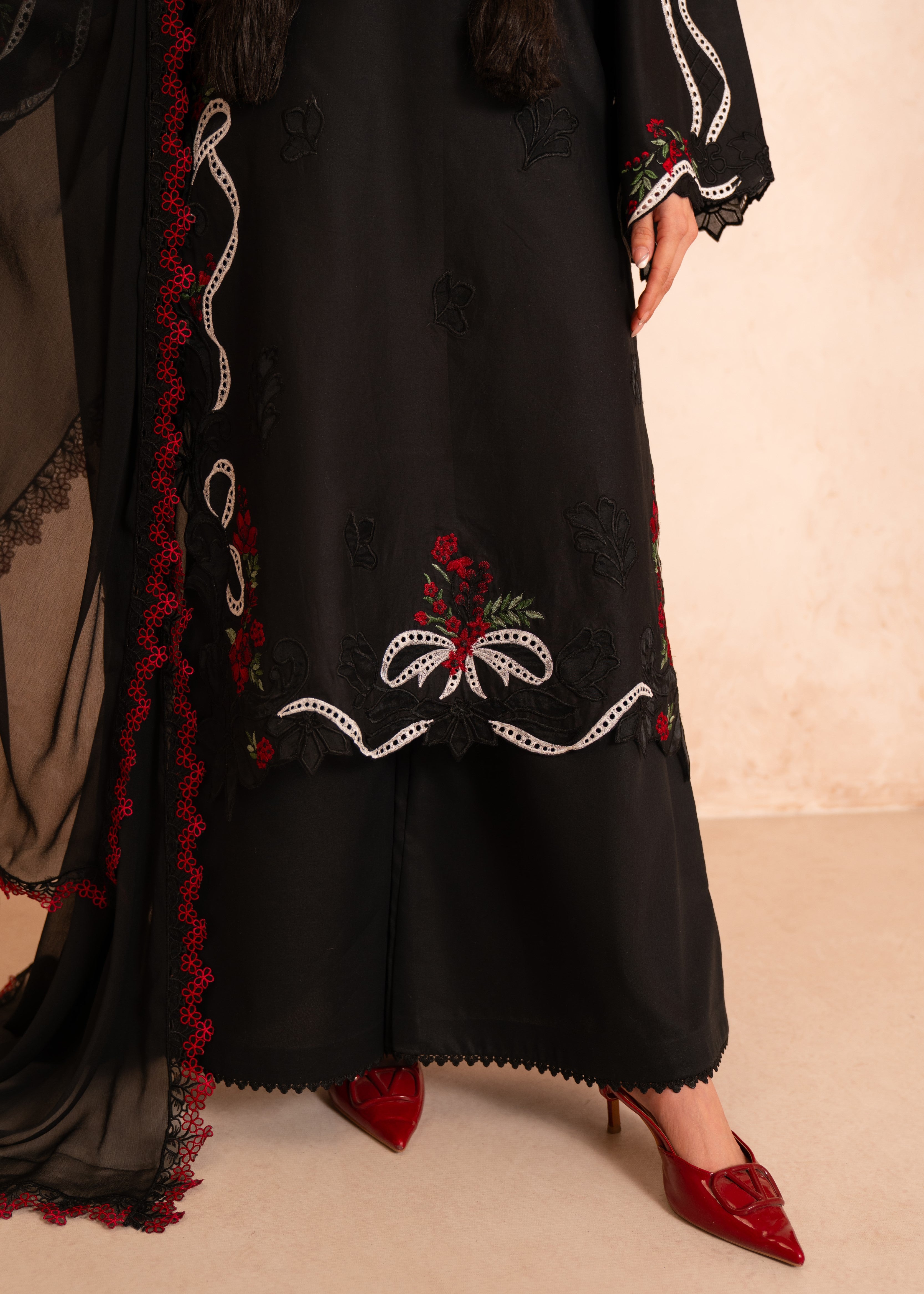 • Deep red and white floral motifs adorning the neckline for striking visual contrast