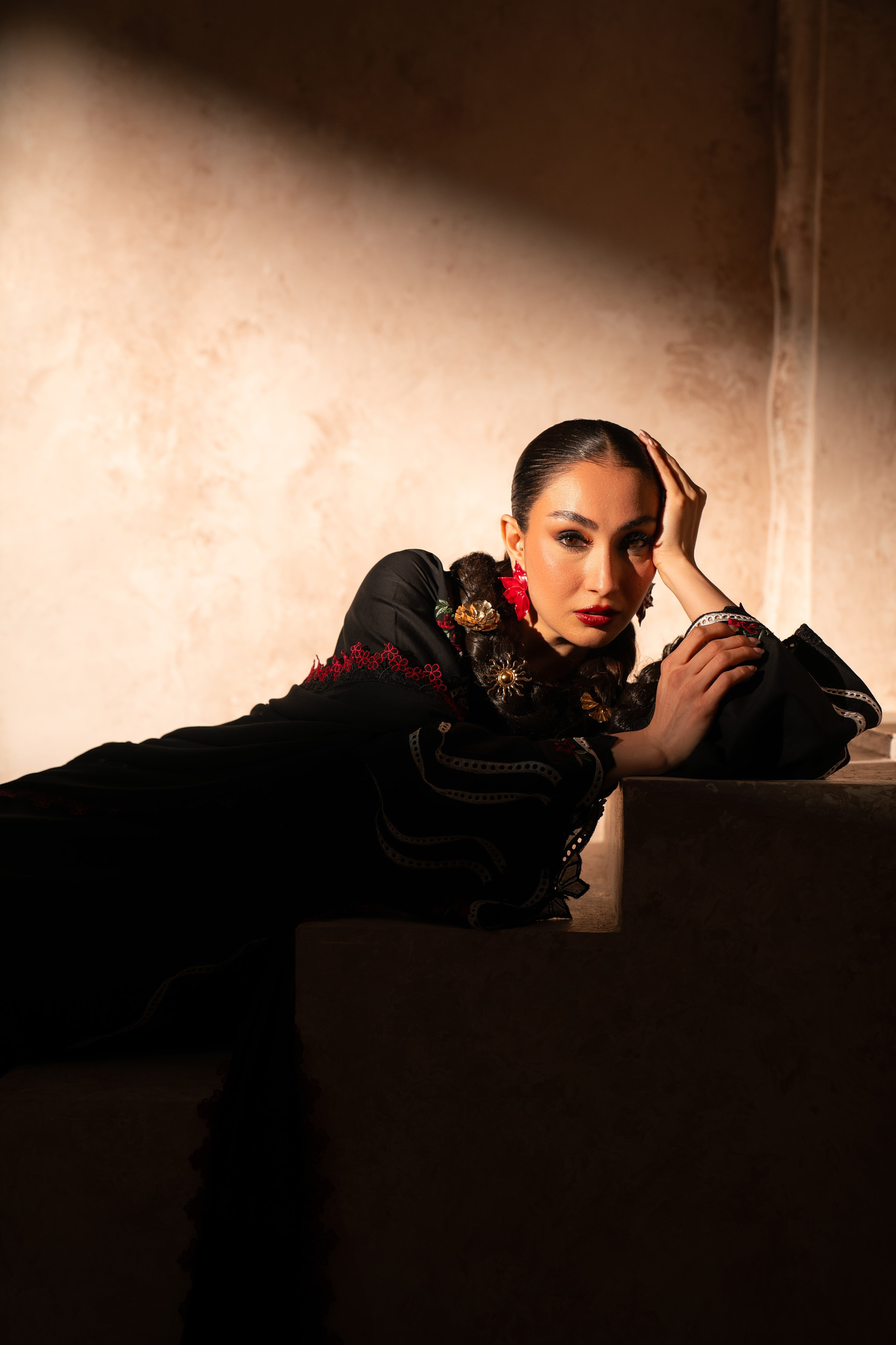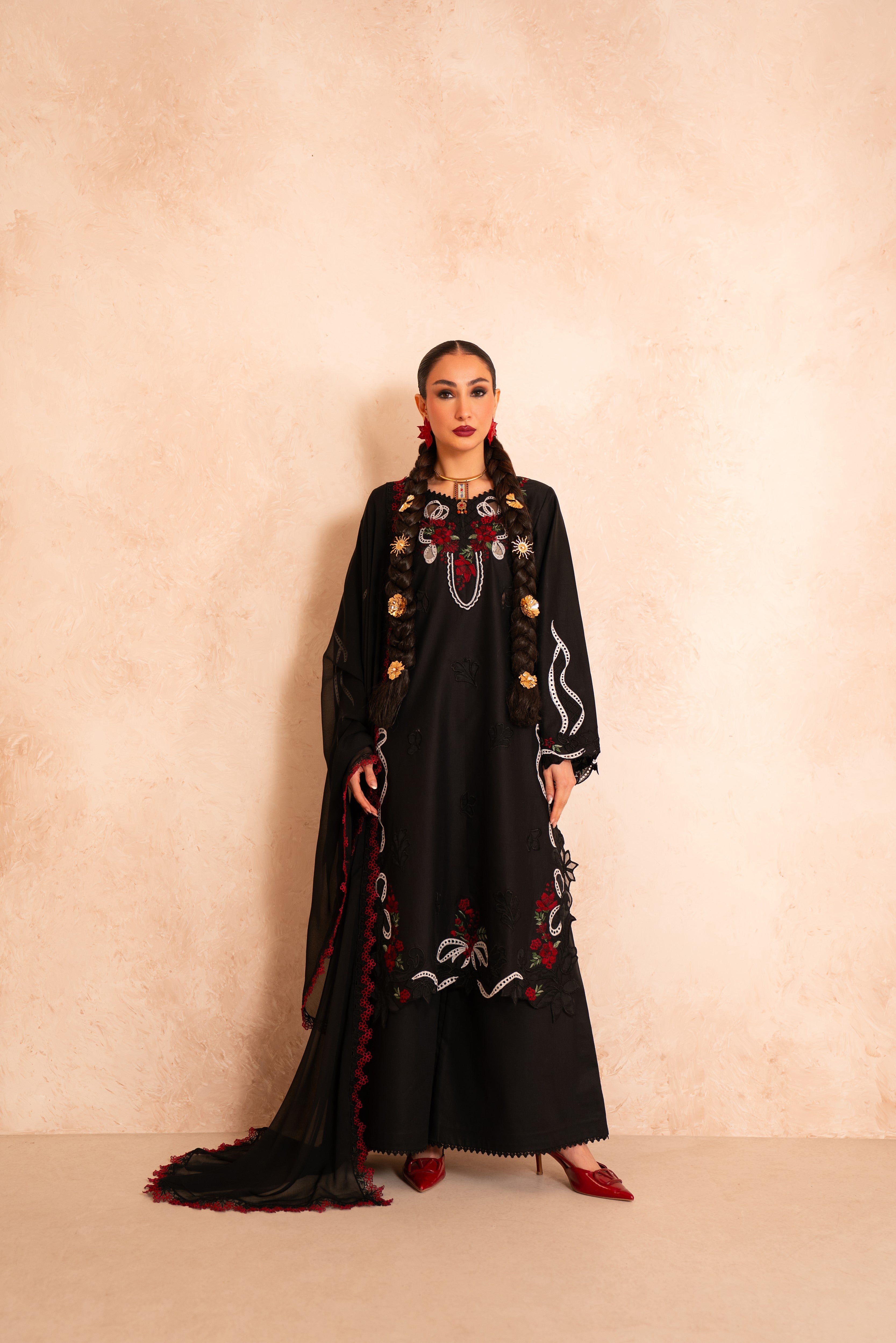 • Red lace-trimmed dupatta with luxurious fabric draping and refined movement