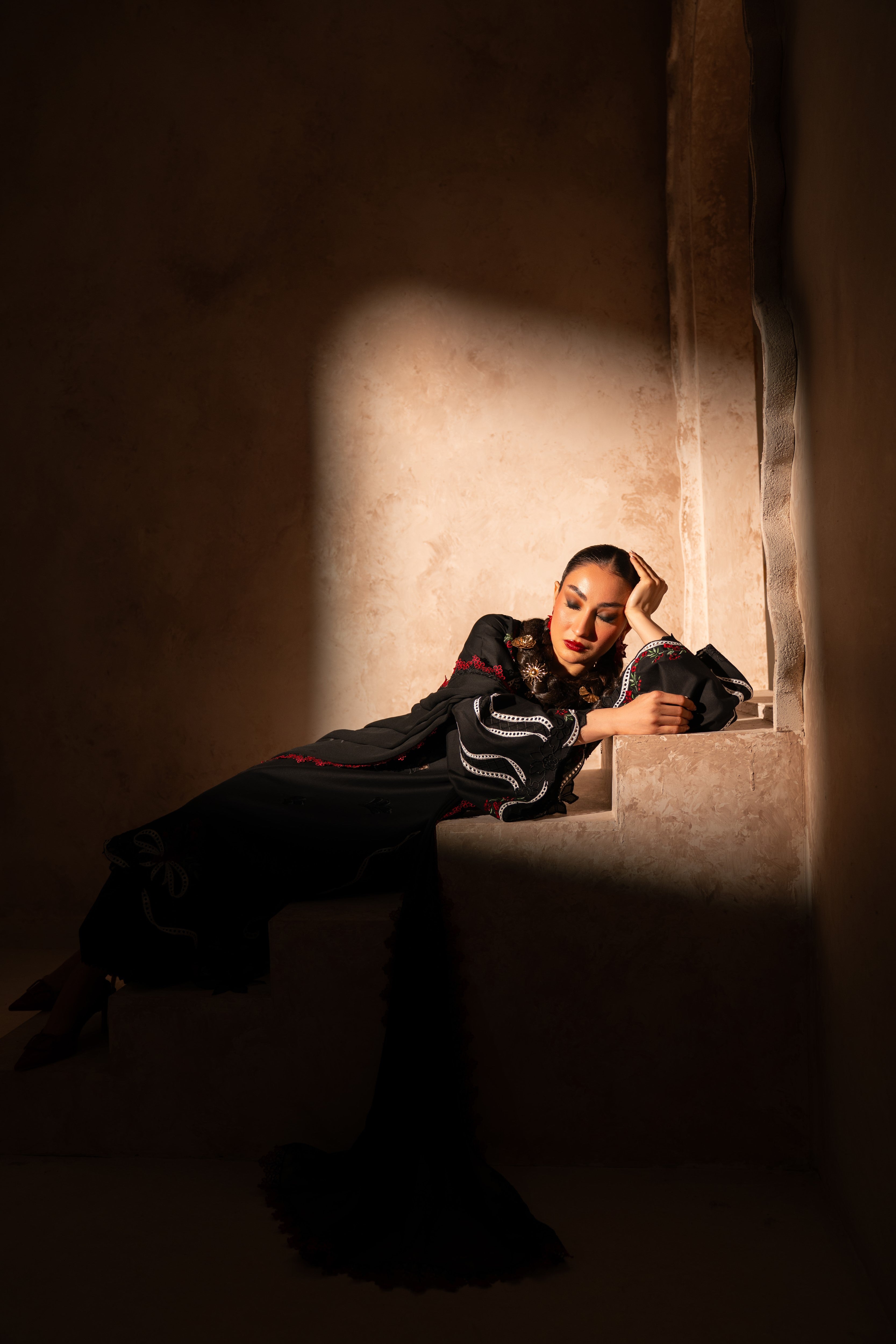 • Bold color palette combining black, red, and white for dramatic impact
