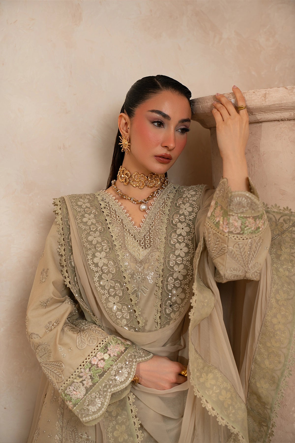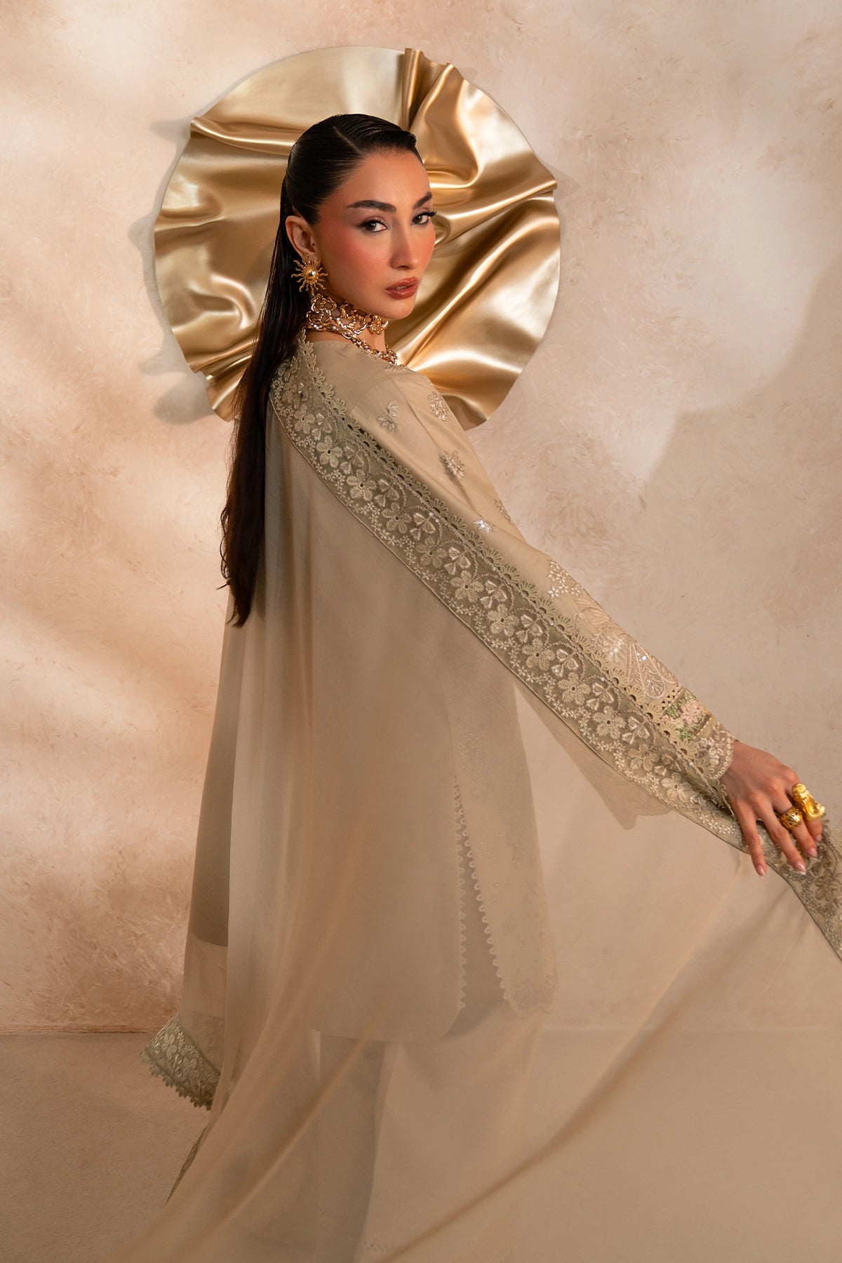 • This ensemble features a sequins-embroidered neckline and a beautifully floral cutwork ghera.